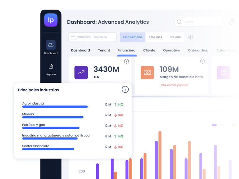 Métricas clave sobre usuarios y operaciones, y permite un seguimiento visual de los procesos de onboarding y autenticación.